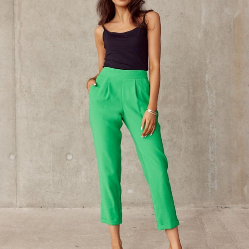 The elegant pants have straight legs finished with a delicate turn-up. This makes them look extremely elegant, even when accompanied by sneakers. There are slanted, slip pockets on the sides and a zipper closure on the side. They come in a solid color scheme, which adds to their timeless style. Made of smooth fabric with a classic cut. The product...