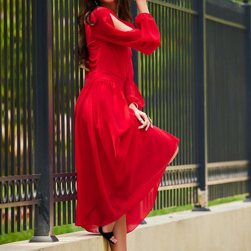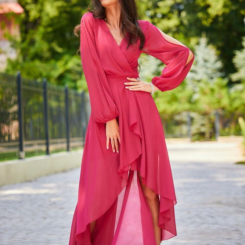 Midi length dress with long buff sleeves. The sleeves are decorated in the form of cracks. The dress features an envelope neckline and tapering at the waist. Zippered at the back with a delicate back exposure. The dress has a sewn-in petticoat, so the fabric will not show through. The overlap neckline will accentuate your slender neck, and the exposed...