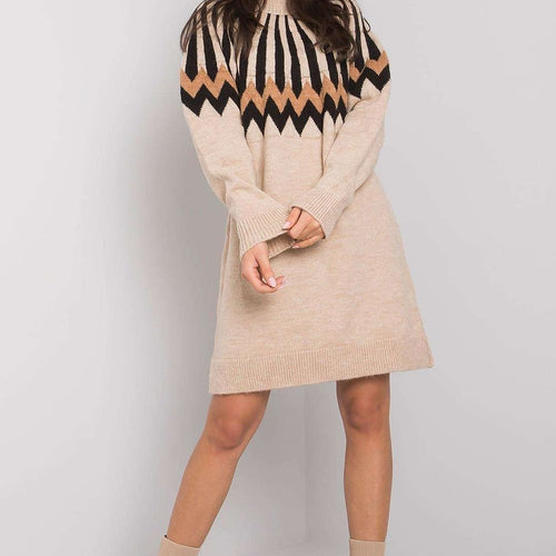 Knitted dress with long sleeves, and a turtleneck. The dress is decorated with a geometric pattern. Perfect for everyday wear and more. Acrylic 76 % Spandex 6 % Polyester 18 % Size Total length Chest one-size-fits-all 89 cm 98 cm