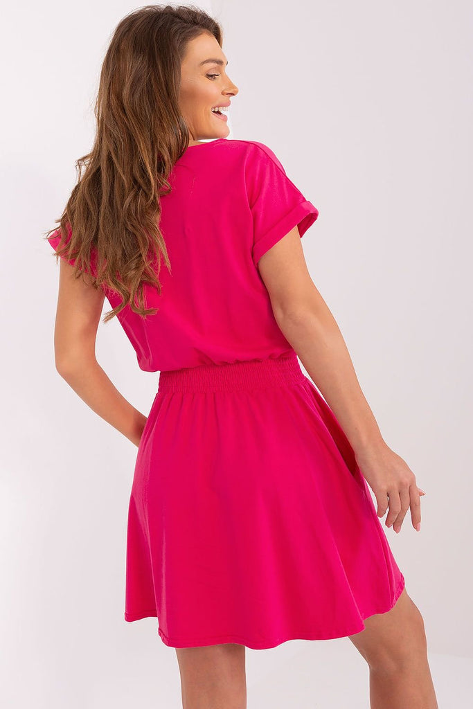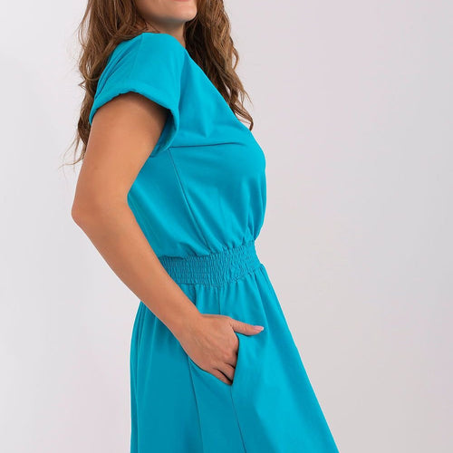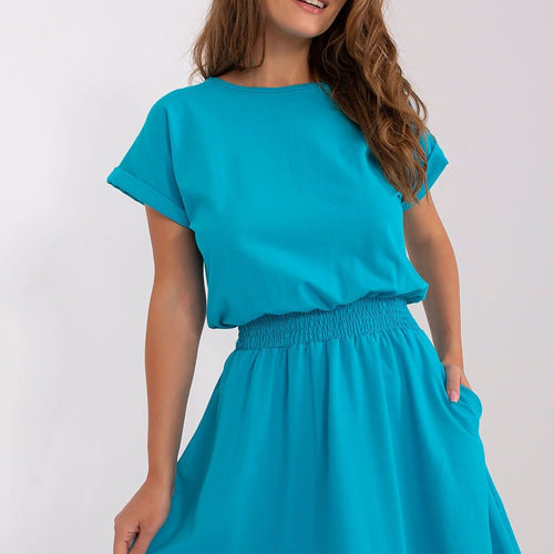 Summer dress in a looser cut with short sleeves and a round neckline. There is a crease at the waist and a flared bottom. Cotton 95 % Spandex 5 % Size Chest Waist L 91 cm 84-90 cm M 86 cm 78-86 cm S 82 cm 72-80 cm XL 96 cm 88-96 cm
