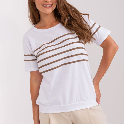 Blouse in a casual cut with short sleeves and a round neckline. Decorative stripes on the front and sleeves. Cotton 90 % Spandex 10 % Size Chest L/XL 91-96 cm S/M 82-86 cm