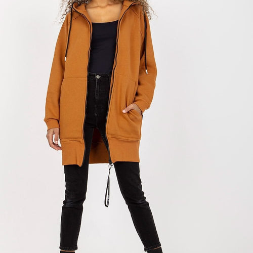 Women's sweatshirt with an extended cut, with long sleeves. Sweatshirt with a hood, zippered. Slip-in pockets on the sides. Cotton 76 % Spandex 4 % Polyester 20 % Size Chest L/XL 91-96 cm S/M 82-86 cm