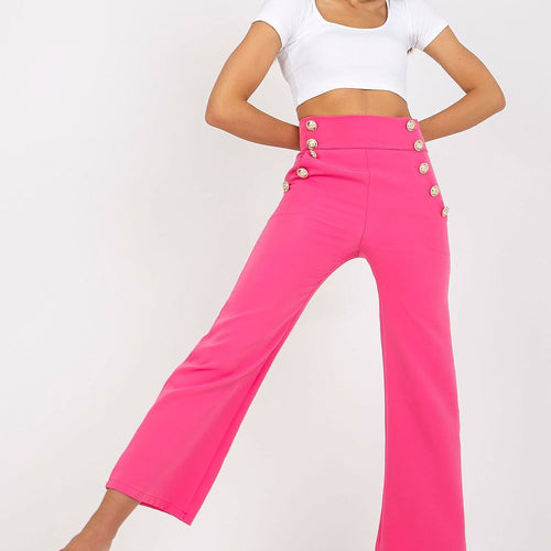 Women's high-waisted pants with decorative buttons on the front. Pants with a covered zip. Pants with slip pockets. Spandex 5 % Polyester 95 % Size Hips width Waist width L 102 cm 84-90 cm M 94 cm 78-86 cm S 90 cm 72-80 cm XL 106 cm 88-96 cm XXL 110 cm 92-100 cm