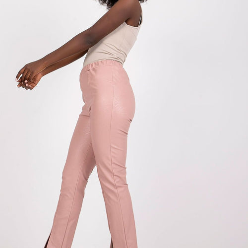 Women's pants made of ecological leather, high rise, with an elastic waistband. Legs with slits. Polyurethane 45 % Viscose 55 % Size Hips width Waist width L 102 cm 84-90 cm M 94 cm 78-86 cm S 90 cm 72-80 cm XL 106 cm 88-96 cm XXL 110 cm 92-100 cm