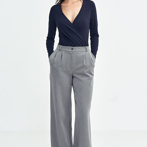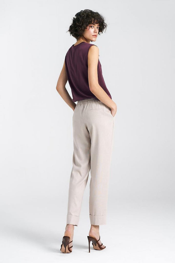 Women's relaxed fit pants made of material decorated with subtle, contrasting tennis-style stripes. They have a medium waist, which ensures comfort when wearing. Decorative pleats are placed on the front, adding elegance and emphasizing the stylish character of the pants. The legs have a wide-leg cut, giving them a wide, loose look. The pants are fastened with a zipper and...