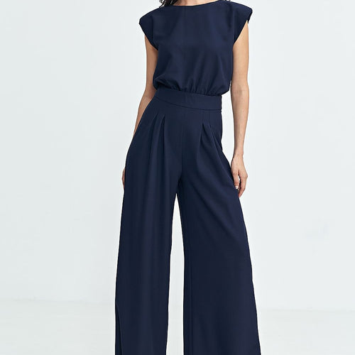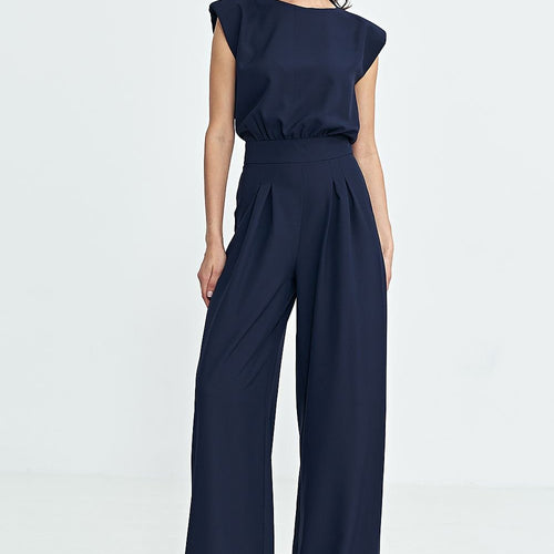A regular fit jumpsuit with an elegant boat neckline, which subtly emphasizes the neck line. There are pillows on the shoulders that emphasize their line, adding distinctness to the silhouette. The jumpsuit is fitted at the waist, accentuating the feminine silhouette. Palazzo-style trousers, wide and loose, give the whole outfit lightness and elegance. The jumpsuit is fastened with a zipper...