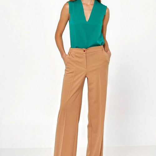 Elegant caramel loose cut trousers will create a cohesive duo with a flowy blouse and oversized blazer in the same color. This model of trousers will visually lengthen the legs, and the high waist will accentuate the waist. The material ensures comfort when wearing. Spandex 4 % Polyester 96 % Size Lenght Hips width Waist width 36 109.5 cm 100...