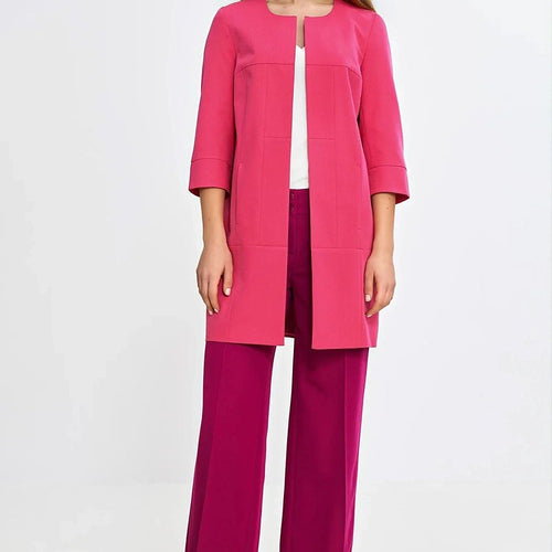 An elegant women's blazer with a regular, slightly loose cut and a length reaching mid-thigh. Made with attention to detail, it perfectly combines comfort with feminine elegance. The model with a round neckline and 3/4 length sleeves is an ideal choice for warmer days and for layered stylizations. The blazer has no fastening, which gives it lightness and a modern...