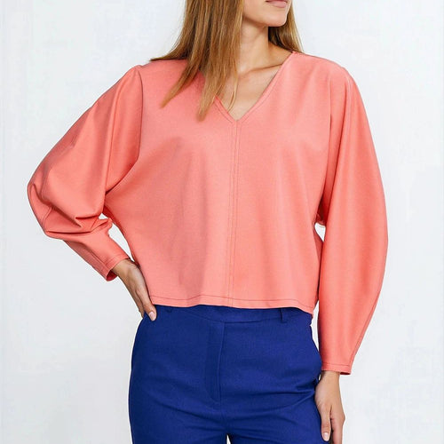 Stylish oversized blouse, made of soft material with a touch of viscose, providing comfort. The V-neck subtly elongates the neck, adding lightness to the styling. Long sleeves are an original combination of a balloon and bat style, giving the whole a unique character. The shorter length makes the blouse go well with high waists. The stitching in the middle of...