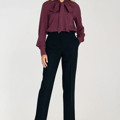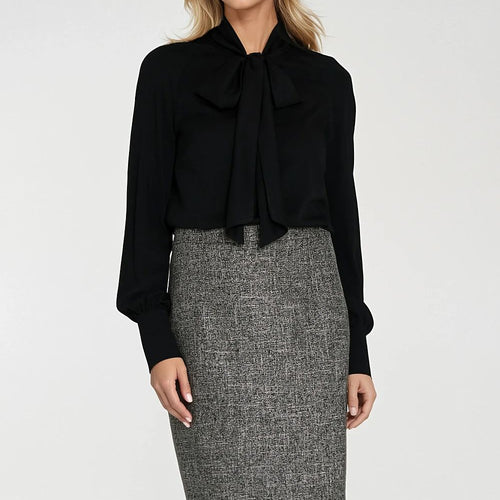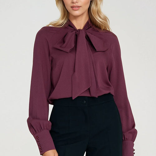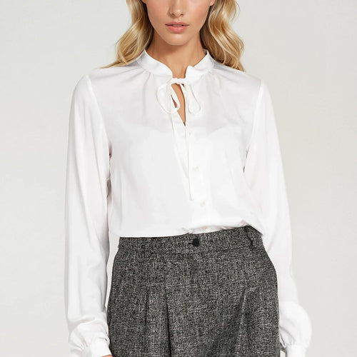 Elegant women's blouse with a regular cut made of delicate, pleasant to the touch viscose. The model has long sleeves with a wide cuff finished with decorative buttons, which adds a subtle elegance to the whole. The blouse is put on over the head and stands out for its wide scarf for tying around the neck, it can be tied...