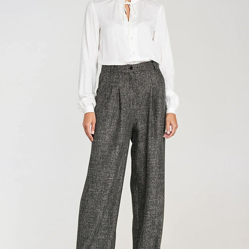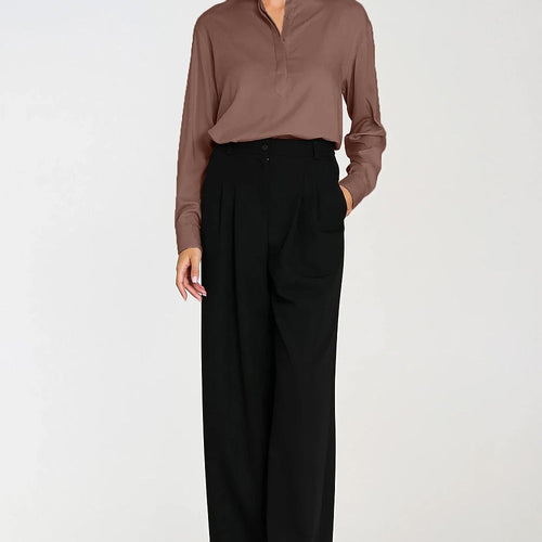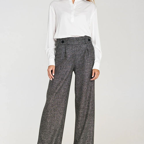 Stylish women's trousers in a relaxed fit made of material with a mottled texture and uneven color, giving them a modern character. The model has a high waist and decorative pleats at the front, subtly emphasizing the silhouette. The wide leg trousers are wide and long, providing comfort and freedom of movement. The trousers have classic front pockets, and the...