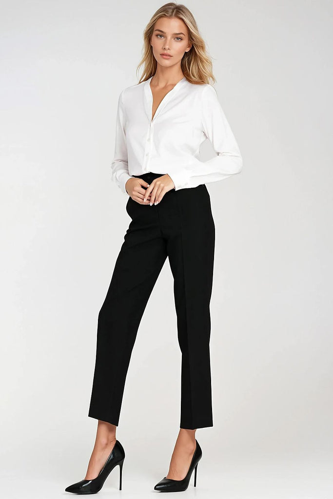 Elegant women's shirt in a blouse cut in a regular style made of light and breathable viscose. The model has a V-neckline, which optically slims the silhouette and adds subtle elegance. The shirt is buttoned, has long sleeves with cuffs, and does not have a collar, giving it a modern, minimalist character. It will work perfectly in both casual stylizations...