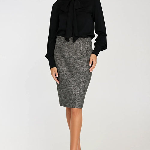 Elegant women's skirt in a fit cut, fitted to the silhouette, made of material with a mottled texture and uneven color, which gives it a unique character. The model is knee-length, making it versatile and suitable for both office and casual styling. At the back, there is a decorative zipper along the entire length of the skirt, adding a modern...