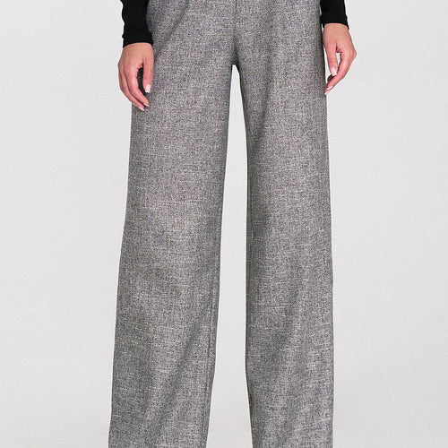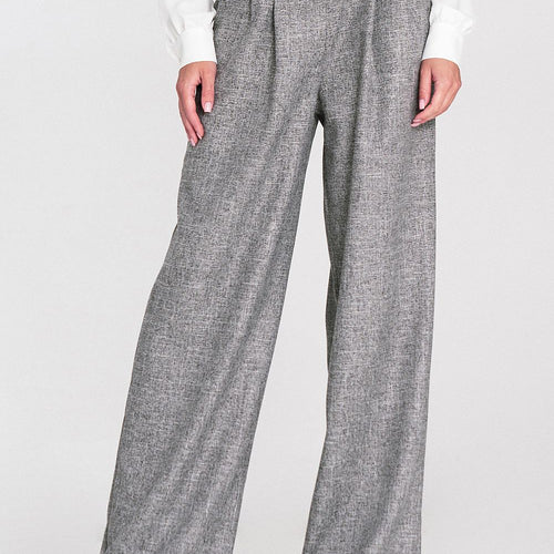Elegant women's trousers in a relaxed fit made of material with a melange texture and uneven color, which gives them a modern, stylish look. The model has a high waist and decorative front pleats that subtly accentuate the silhouette. The wide leg trousers are wide and long, providing comfort and freedom of movement. The trousers have a front zip and...