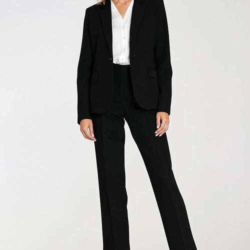 An elegant women's fitted jacket, tailored to the silhouette, is the perfect choice for women who appreciate classic style in a modern version. The model has a collar with classic lapels and long sleeves with shoulder pads that subtly shape the silhouette. The jacket has a hip-length and is fastened with one button, emphasizing the fitted cut. At the front,...