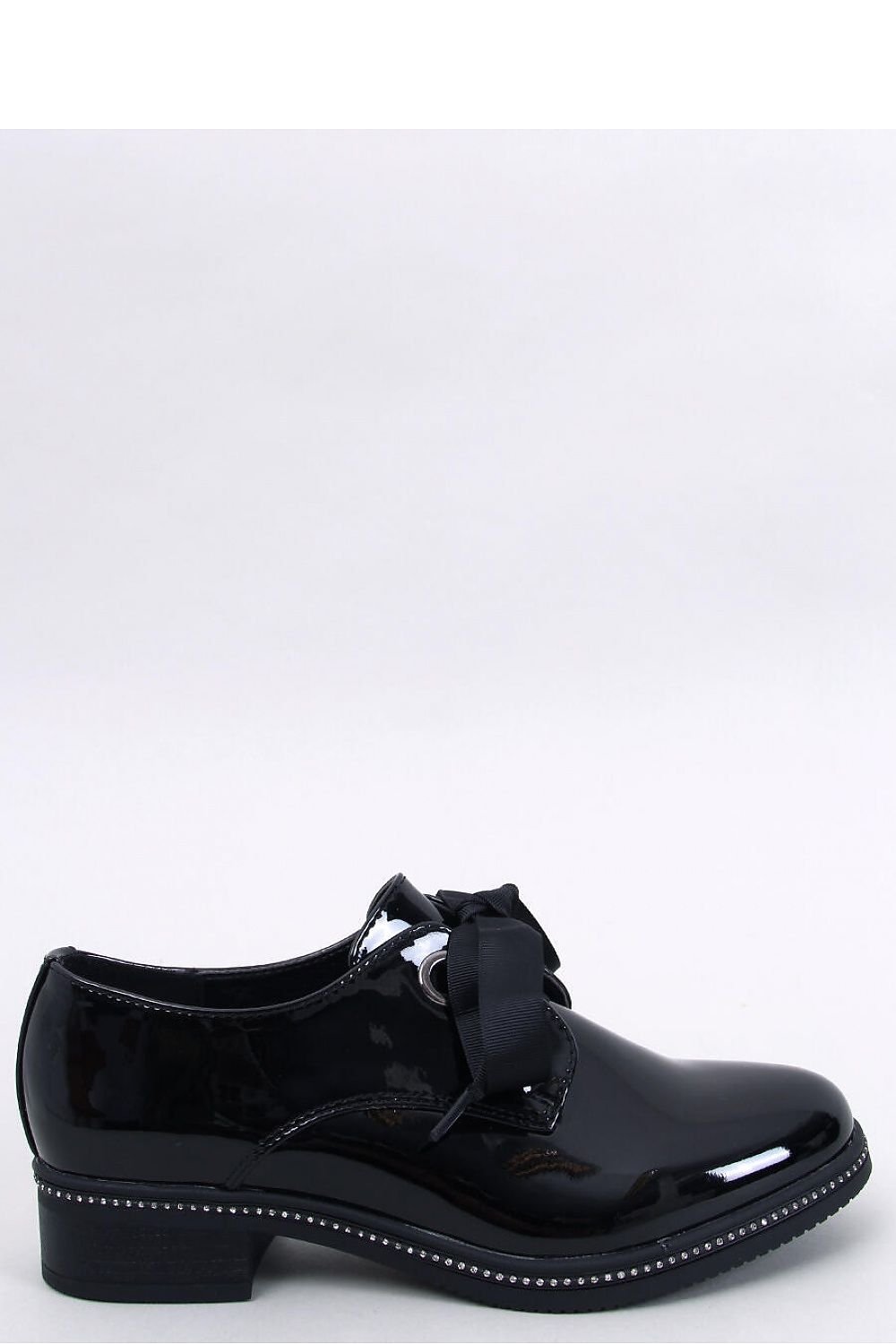 Lacquered moccasins - half shoes for women. Combination of timeless classics with modern accents ? wide ribbon and zircons around the sole. Not only do they look great on the leg, they are also incredibly comfortable. They are made of patent leather, which adds extravagance.