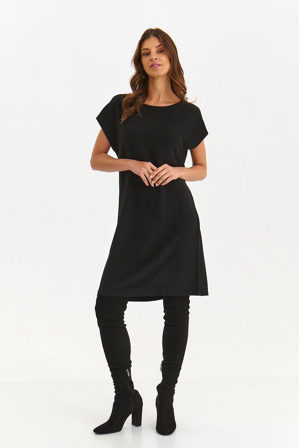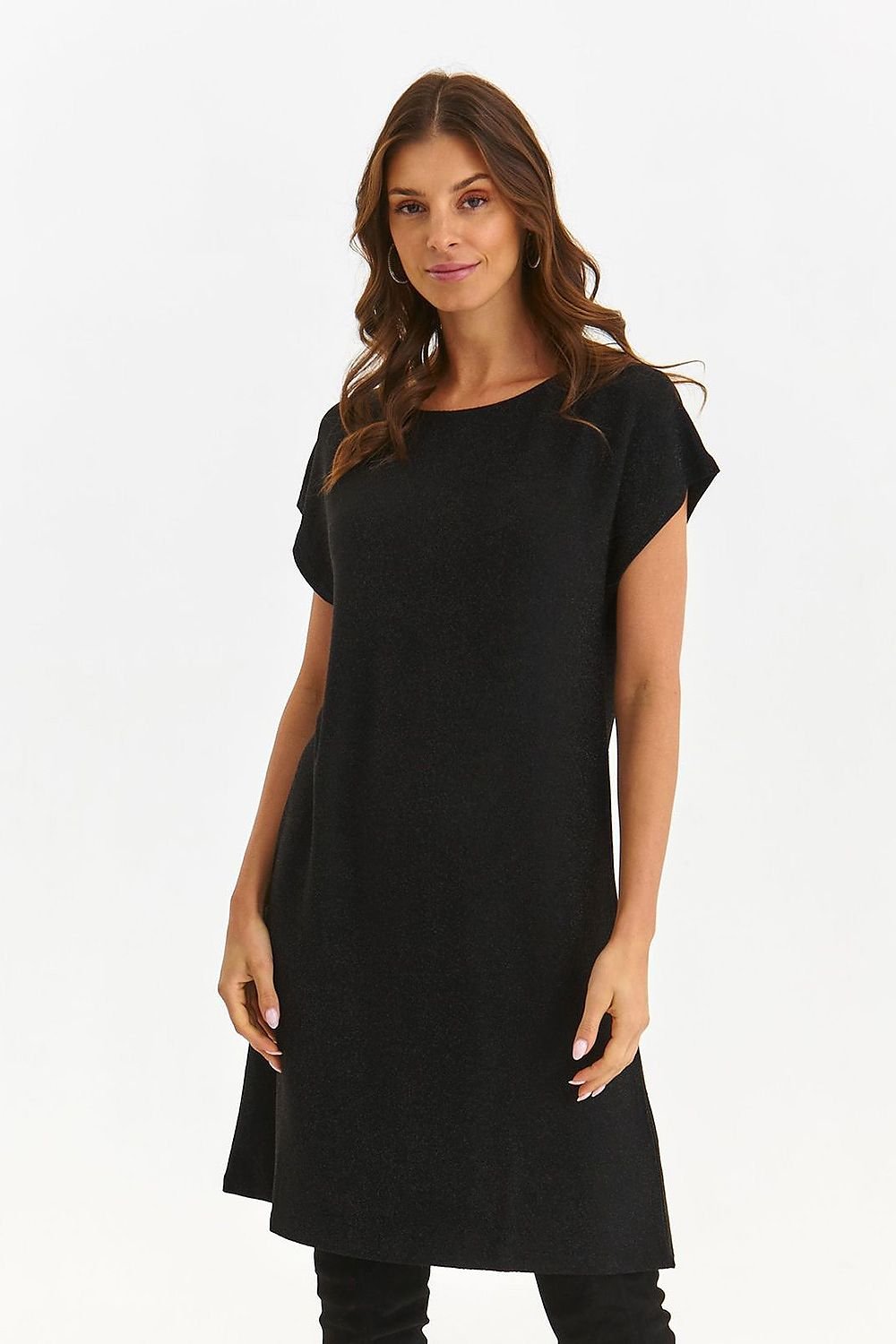 This is a dress with a slightly looser cut, with short sleeves and a round neckline for comfortable wear. Its fabric finished with a shiny thread adds a subtle sheen, giving it an elegant yet comfortable feel. Perfect for evening outings or special occasions, it adds subtle sparkle and expression to any styling.