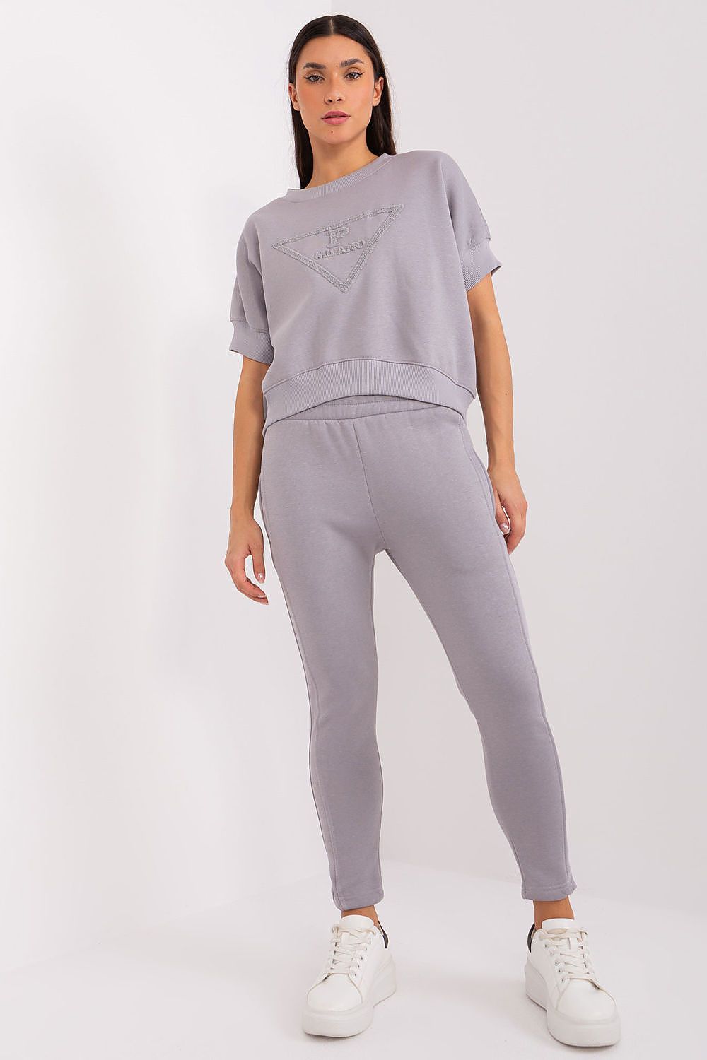 Insulated women's casual sweatshirt set, ideal for colder days, consists of a sweatshirt and pants. Made from a combination of cotton and polyester, the set provides warmth, comfort and durability, ideal for everyday styling. The standard-length sweatshirt has short sleeves and a round neckline, giving it a lightweight and casual feel, despite the warmth. On the front of the sweatshirt there is a fashionable print, which adds originality and youthfulness to the set. The smooth design maintains a minimalist, universal look, easy to combine with other garments. The pants have tapered legs and a high waist, which accentuates the silhouette and ensures wearing comfort. There is an elastic waistband that guarantees a perfect fit. In addition, the pants are equipped with side slip pockets, making them a practical choice for everyday wear. This set is the perfect combination of comfort and style for cold, everyday days.