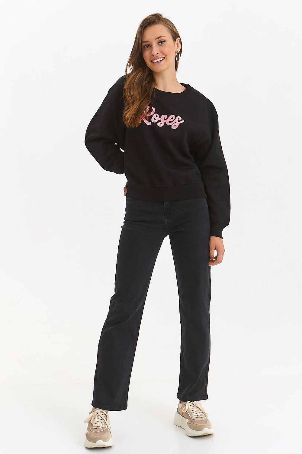 This women's sweatshirt is a combination of comfort and style. It has long sleeves and a round neckline, which makes it ideal for various occasions. There is an inscription on the front of the sweatshirt, which adds to its character. Both the hem and sleeves are finished with a ribbed hem, ensuring a proper fit and comfortable wear. It's a great choice for an everyday outfit that will make you feel casual and fashionable at the same time.