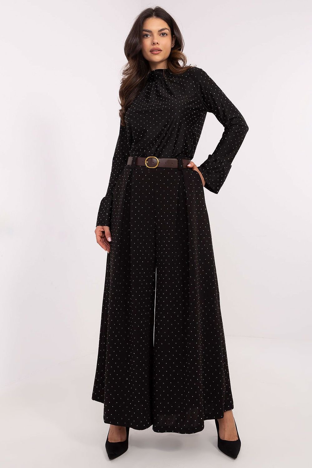 Delight in a stylish look thanks to women's palazzo pants, which combine elegance with refined shine. Made from a high-quality blend of polyester and viscose, they provide comfort and excellent presentation. The high waist accentuates the waist, while the wide legs add lightness and elegance, perfect for formal outings or events. The entire surface of the fabric is adorned with subtle sequins, giving the pants a unique character, and the fastened belt allows for a perfect fit to the silhouette. Inset side pockets add practicality without disrupting the elegant design. The lack of closures on the legs makes the pants look minimalist, but with a touch of luxury. This is the perfect choice for evening outings, banquets, or special occasions, add a stylish top and heels to create a stunning look!
